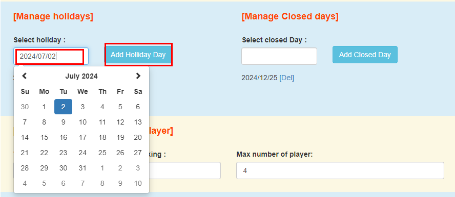3. Manage Open Days and Max player