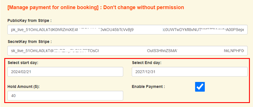 Go to the STRIPE site and make a new account for your company. Then, you will receive a public key and secret key for holding any amount of total payment during the booking.