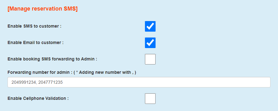 ‘Enable booking SMS forwarding to Admin’ : All booking confirmation messages are forwarded to Admins too. but admin numbers are needed below input box.