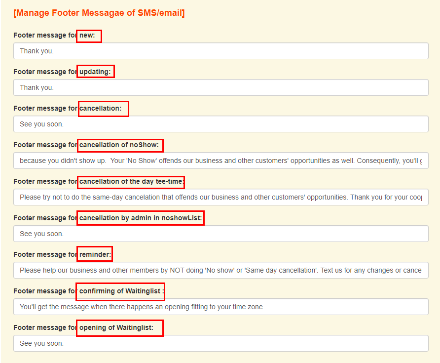 3. Footer message : Email or SMS footer messages for each case. These message are placed at the end of message with booking information.